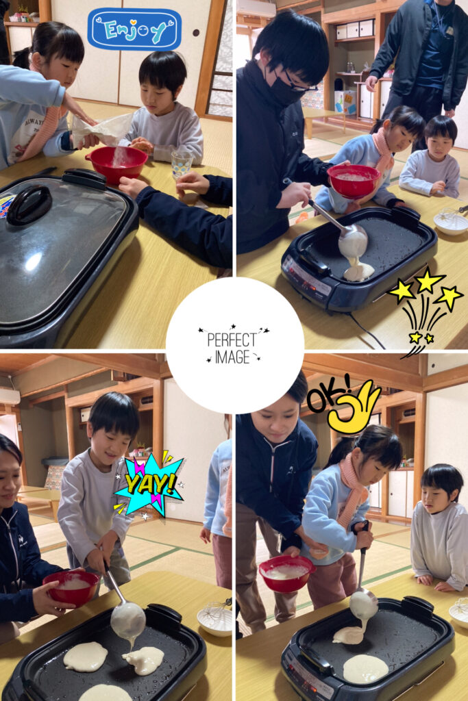 そして帰ってからさっそくホットケーキ作りを始めたよ🤗うまく混ぜることもできて、ホットプレートの上にゆっくりと一生懸命できたよね👏